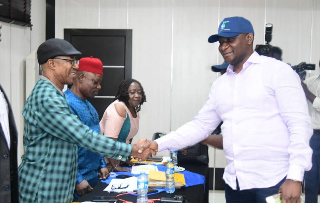 The NDDC Managing Director, Dr Samuel Ogbuku (right), being introduced to members of the interview panel by Engr. Prof Na Okereke during an assessment visit to the venue of the foreign postgraduate scholarship interviews in Port Harcourt.